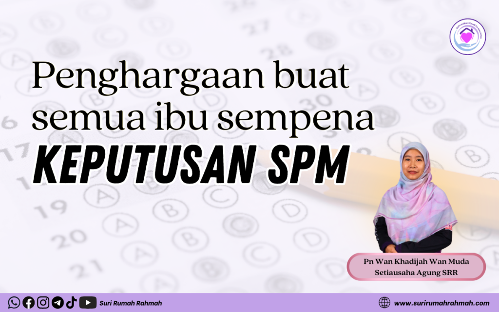 Dengan penuh rasa syukur ke hadrat Allah SWT, saya Wan Khadijah Wan Muda, Setiausaha Agung Persatuan Suri Rumah Rahmah Malaysia ingin menzahirkan setinggi-tinggi penghargaan kepada semua ibu yang mempunyai anak-anak yang menerima keputusan SPM baru-baru ini khususnya kepada para ibu yang bergelar suri rumah.